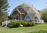 2) Стратодезический купол. Такой дом в виде сферы делится на небольшие трапеции и прямоугольники. Такая форма дома позволяет встраивать и двери и окна классической формы, тем самым не переплачивая. В данной технологии обратная особенность сборки. Каркас обшивается по мере установки стоек. И в данной сборке коннектора не требуются совсем. Вся конструкция соединяется между собой при помощи специальных замков.